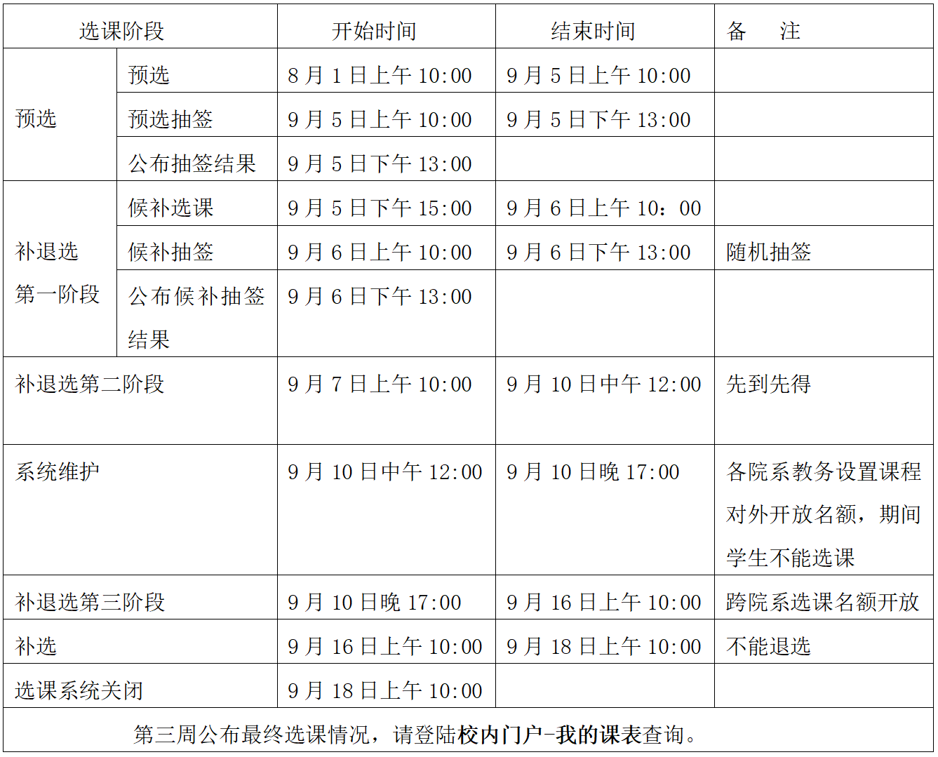 2、所有本科生请在学校规定的时间内进行选课,退课、补选及相关课程调整,选课结束后,选课系统封闭,学生将不能再进行网上操作。